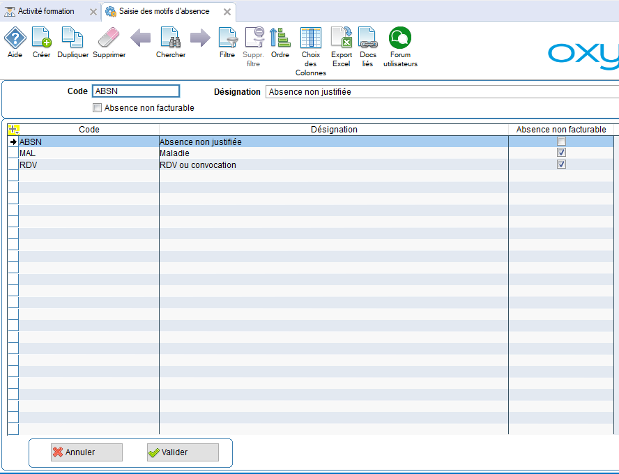 Cette liste des motifs d'absence est libre, il n'y a pas de contenu pré rempli. Elle sera utilisée lors de la saisie des absences, pour renseigner le motif de chaque absence de stagiaire. Le but est de pouvoir distinguer les absences non facturables de celles facturables.