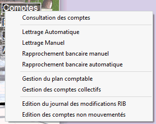 Dans la liste des comptes, un clic souris droit vous permet d’accéder à un menu contextuel pour l’édition du grand livre et la visualisation de la fiche compte.
