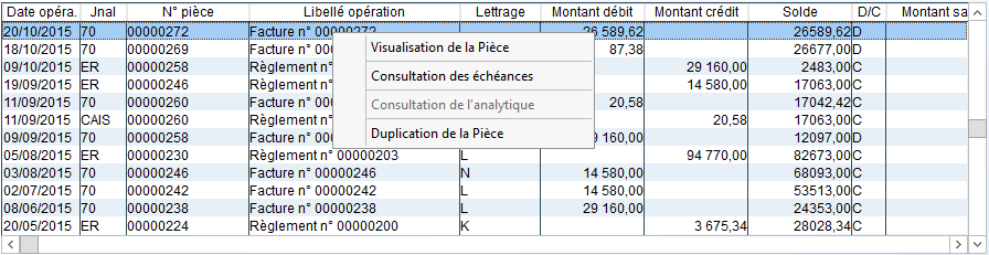 Un clic souris droit sur une ligne d’écriture vous permet d’accéder au détail de la pièce.