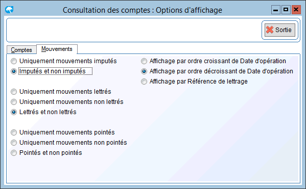 · Pour les mouvements : Avec les cases d’options, choisissez si vous souhaitez visualiser uniquement les mouvements imputés, uniquement les mouvements lettrés ou non lettrés et indiquez enfin dans quel ordre seront classés les mouvements à l'écran.