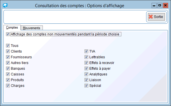 · Pour les comptes : Vous allez choisir quel(s) type(s) de comptes vous souhaitez visualiser. Choisissez si vous souhaitez visualiser les comptes non mouvementés pour la période que vous avez définie. Ensuite, indiquez la nature des comptes à visualiser en cochant les cases correspondantes. Si vous souhaitez tous les visualiser, cochez la case "Tous".