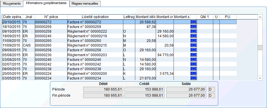 L’écran de consultation des comptes vous permet de visualiser à la fois les mouvements et les masses mensuelles d’un compte.