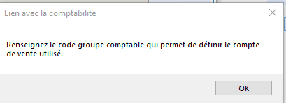 Nouveauté depuis la version 11.01 Oxygène : lors de la création des articles si vous ne remplissez pas la zone qui est définie comme critère pour la liaison comptable, un message non bloquant vous alerte :