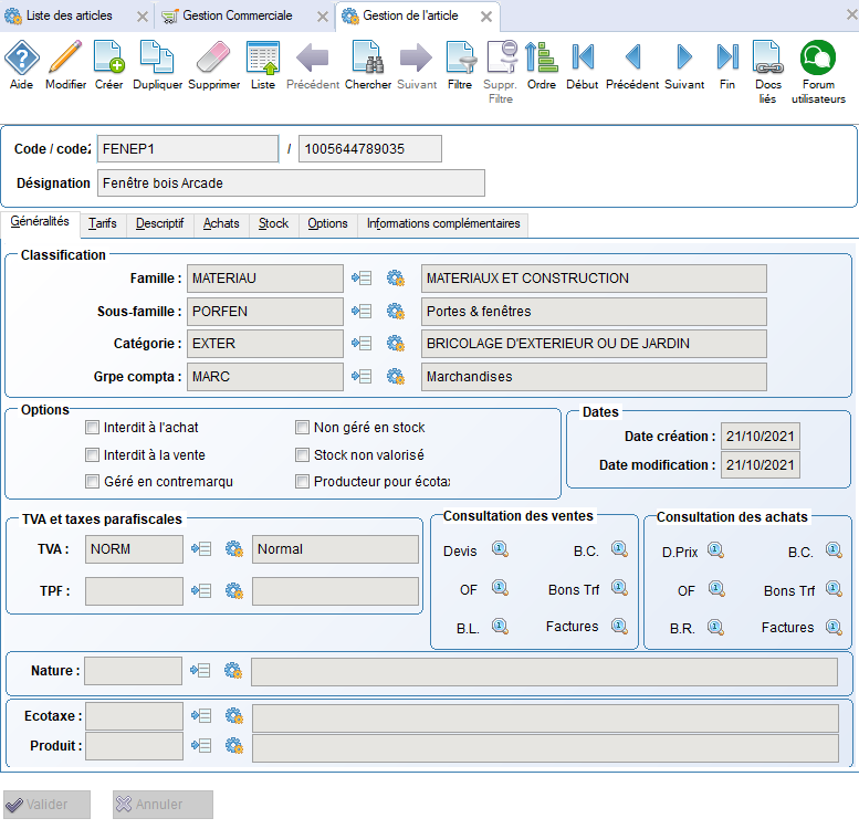 - Interdit à la vente : permet d'interdire l'article à le vente. Celui-ci ne pourra être utilisé dans un document de vente.