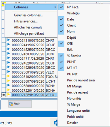 Par exemple vous pouvez faire afficher les colonnes de montants de la marge. Ces colonnes de marge sont affichées ou pas selon les droits utilisateurs, en effet il est possible de cacher ces données en limitant les droits pour certains utilisateurs, si on ne veut pas que ceux-ci puissent accéder à ces valeurs.