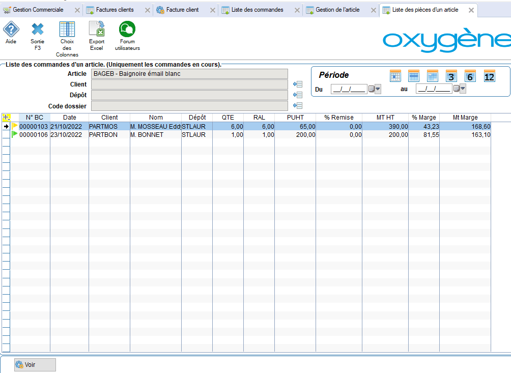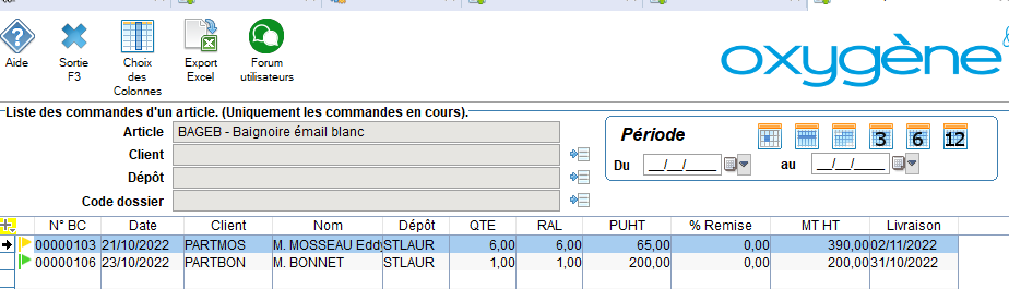 En cliquant sur le bouton , vous pouvez consulter la liste des devis, BC, BL en cours pour cet article, ainsi que les facture et les bons de transfert inter-dépôt en cours de préparation.