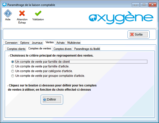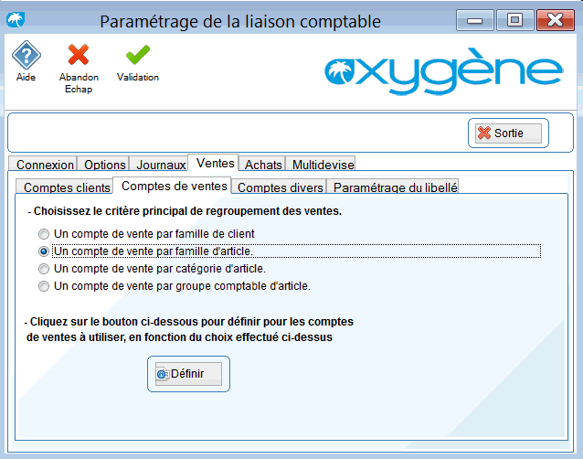 2ème cas : regroupement dans un compte de ventes par famille d’article (ou premier niveau de classification des articles que vous avez défini en gestion commerciale).