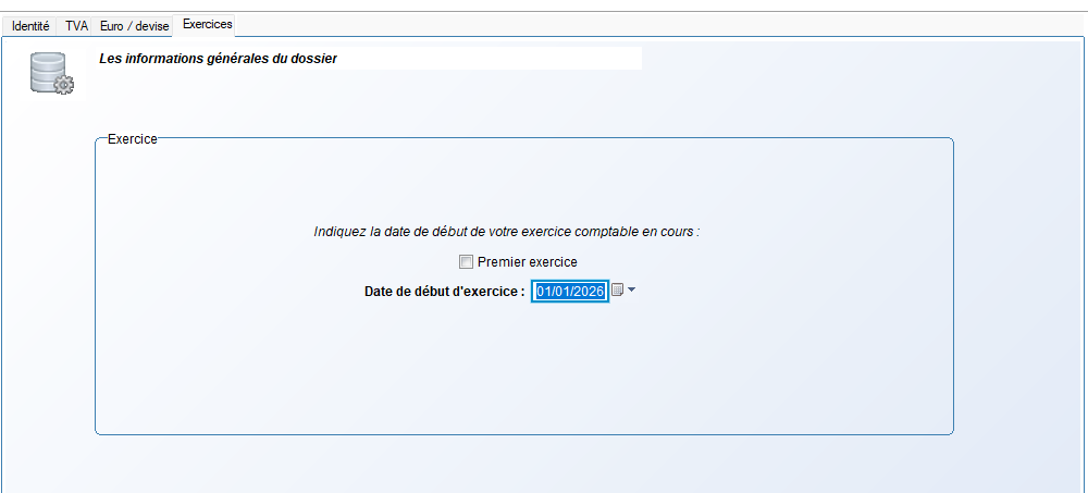 Dans l'onglet Exercices, il est demandé de saisir la date de votre exercice comptable en cours. Attention, cette étape ne sera visible que lors de la création du dossier. Si vous souhaitez la corriger, rendez-vous dans les Paramètres société de chacune des applications : Gestion Commerciale et Comptabilité.