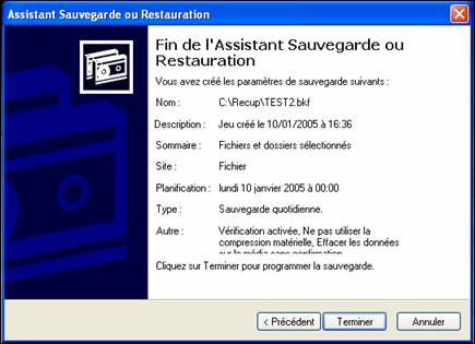 Il apparaît enfin un écran de récapitulation des paramètres de la sauvegarde.