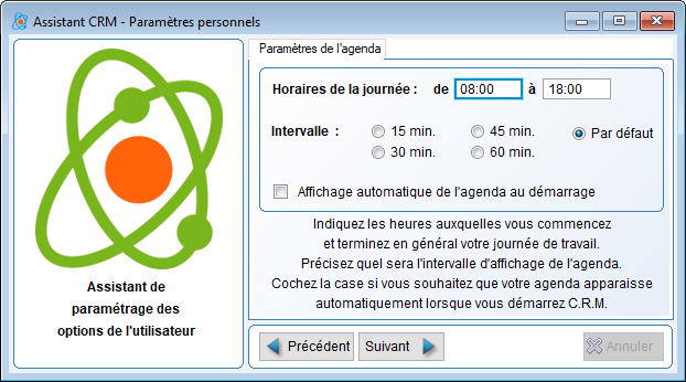Deux utilisateurs (à mi-temps inverses) peuvent utiliser le même poste. Lorsque l'utilisateur lancera pour la première fois le CRM sur ce poste, l'assistant se lancera (donc il se lancera deux fois dans le cas des mi-temps).