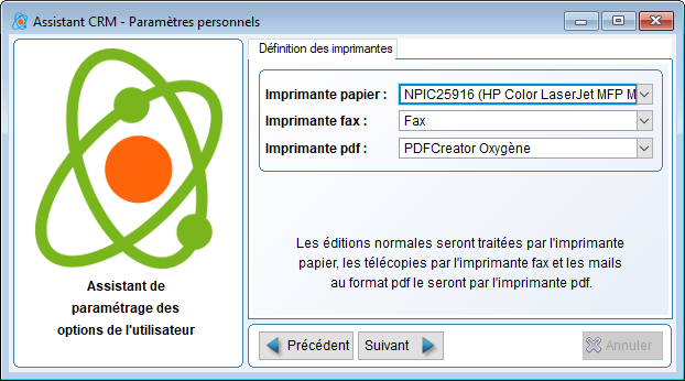 Cette étape permet de paramétrer des imprimantes par défaut pour le poste de travail et pour l'application CRM.