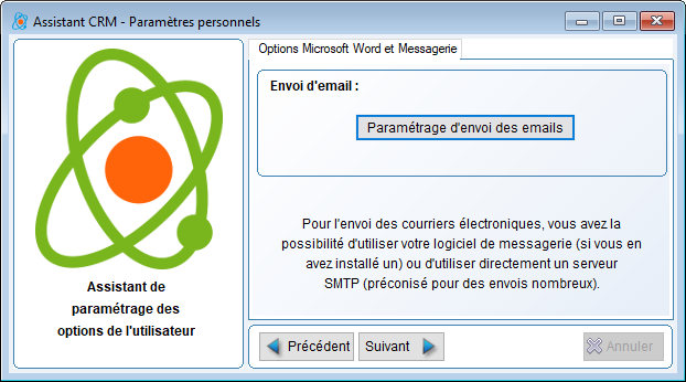 Après validation des données de paramétrage du dossier, l'assistant de paramétrage du poste de travail, est lancé automatiquement par l'application. Lorsqu'un utilisateur lance le CRM pour la première fois sur un poste, l'assistant de paramétrage est lancé automatiquement.