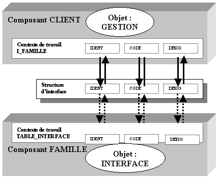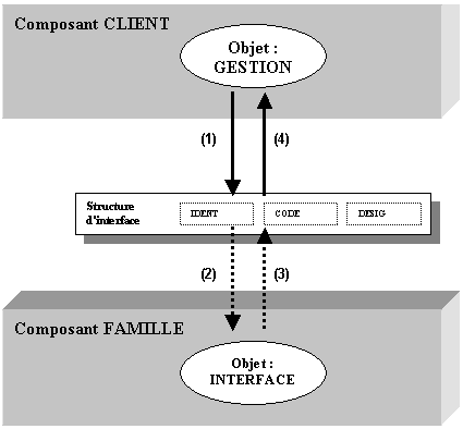 Dans le schéma ci-dessus, l'objet GESTION du composant CLIENT fait appel à l'une des méthodes publiques du composant FAMILLE. La structure d'interface sert de "relais" entre les deux composants. Les flèches numérotées du schéma symbolisent les opérations effectuées sur les données d'interface. Nous allons détailler chacune des opérations en précisant par qui elles sont traitées.